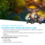 This new generation, extremely bright Warm White Add-On light makes adding additional lights simple. Comes complete with weighted base and garden spike for use in or out of your pond. Transformer not included.